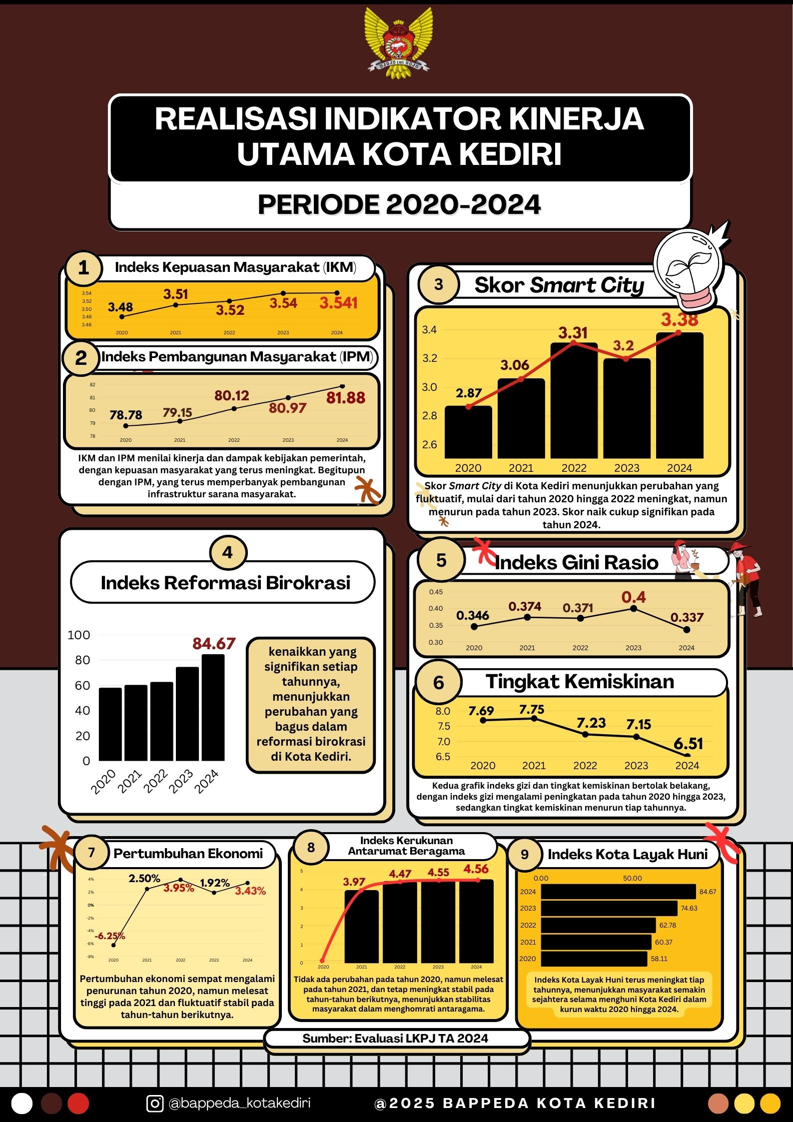 Selama kurun waktu 2020 hingga 2024, capaian Indikator Kinerja Utama (IKU) Pemerintah Kota Kediri menunjukkan tren positif dengan peningkatan konsistensi dari tahun ke tahun. Tahun 2020 menjadi awal yang penuh tantangan karena pandemi COVID-19, sehingga beberapa target indikator mengalami penyesuaian. Namun, Kota Kediri mampu mempertahankan kinerja pemerintahan yang stabil. Pada tahun 2021, terjadi perbaikan yang signifikan di berbagai sektor, ditandai dengan meningkatnya jumlah indikator yang tercapai seiring dengan mulai pulihnya kondisi sosial dan ekonomi daerah. Tahun 2022 merupakan masa akselerasi pembangunan, di mana sekitar 73% IKU tercapai dengan baik. Hal ini didukung oleh penguatan sistem pengelolaan keuangan daerah, pemanfaatan teknologi informasi dalam pelayanan publik, serta peningkatan koordinasi antar perangkat daerah. Tahun 2023 mencatatkan capaian terbaik selama lima tahun terakhir. Hampir seluruh IKU berhasil mencapai target, mencerminkan efektivitas perencanaan dan pelaksanaan program pembangunan, khususnya dalam bidang pendidikan, kesehatan, pengendalian inflasi, dan penanggulangan kemiskinan. Memasuki tahun 2024, capaian IKU mengalami konsolidasi karena adanya penyesuaian kebijakan dan indikator sebagai bagian dari transisi menuju periode perencanaan jangka panjang tahun 2025–2045. Meski demikian, sebagian besar indikator tetap berada dalam kategori tinggi atau cukup tercapai. Secara keseluruhan, capaian IKU Kota Kediri selama 2020–2024 merefleksikan kinerja pemerintahan yang adaptif, responsif, dan berorientasi pada hasil, serta menjadi fondasi penting bagi pelaksanaan pembangunan daerah yang lebih terarah di masa mendatang.